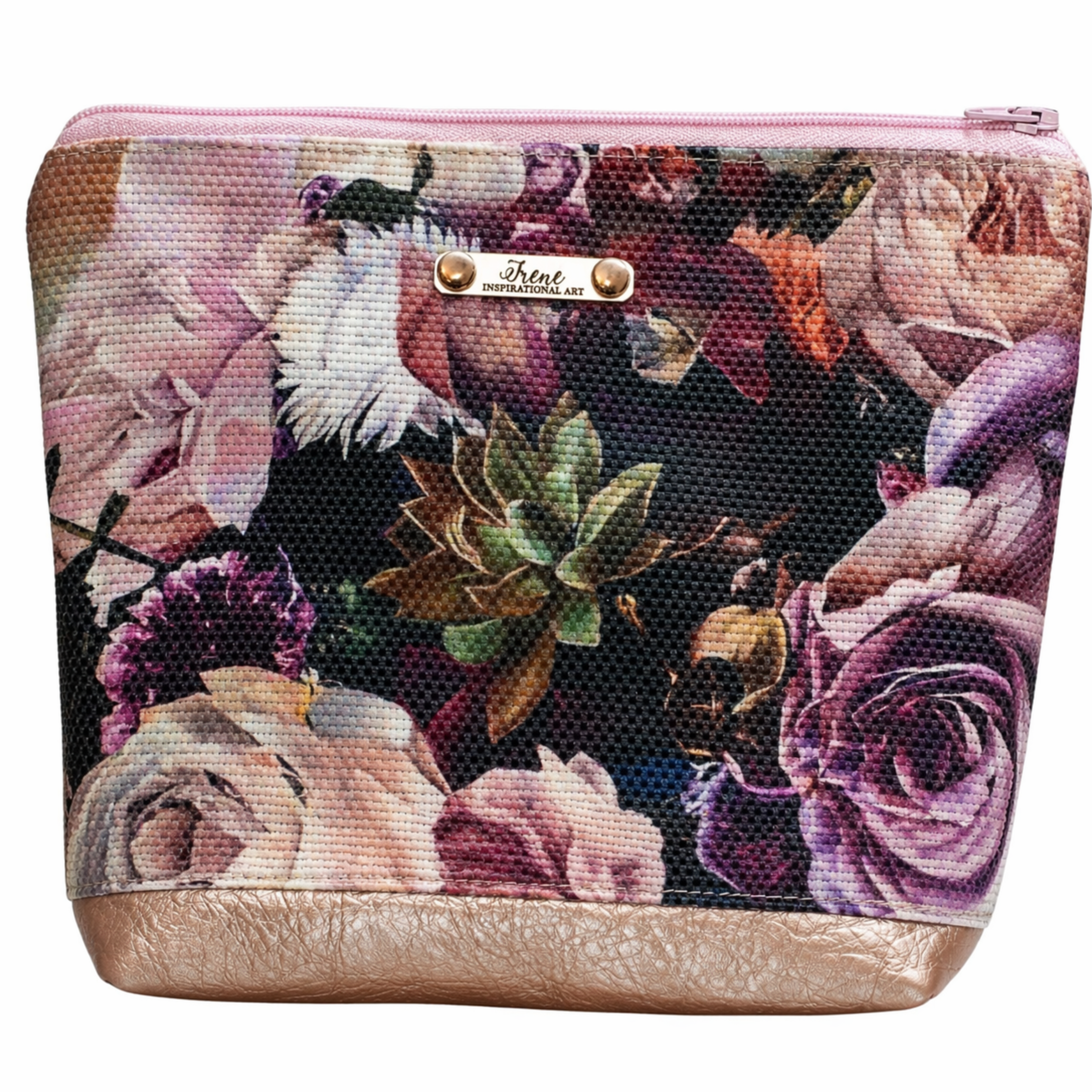 This beautiful makeup bag features a durable leather-look bottom with a printed waterproof fabric top, making it both elegant and easy to clean. Perfect for storing makeup, skincare, brushes, and beauty essentials at home or on the go.