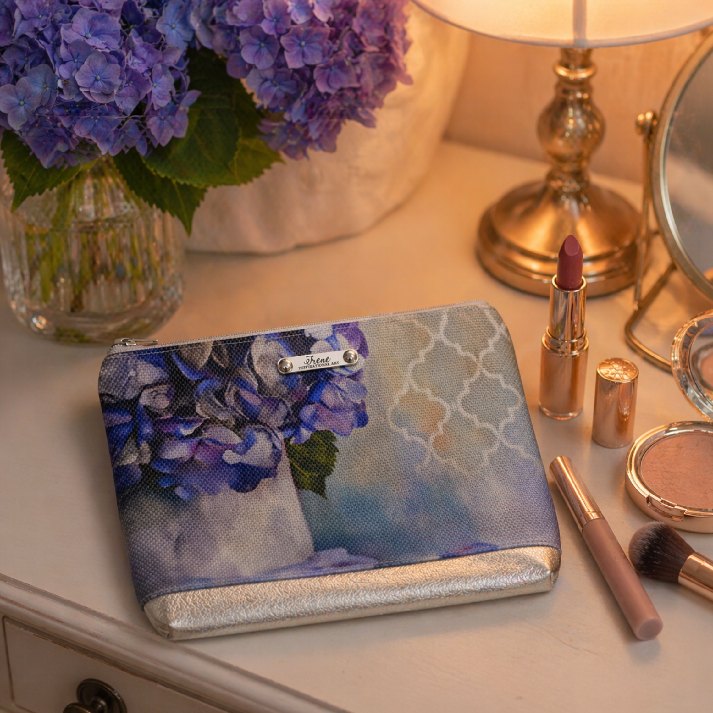 This beautiful makeup bag features a durable leather-look bottom with a printed waterproof fabric top, making it both elegant and easy to clean. Perfect for storing makeup, skincare, brushes, and beauty essentials at home or on the go.