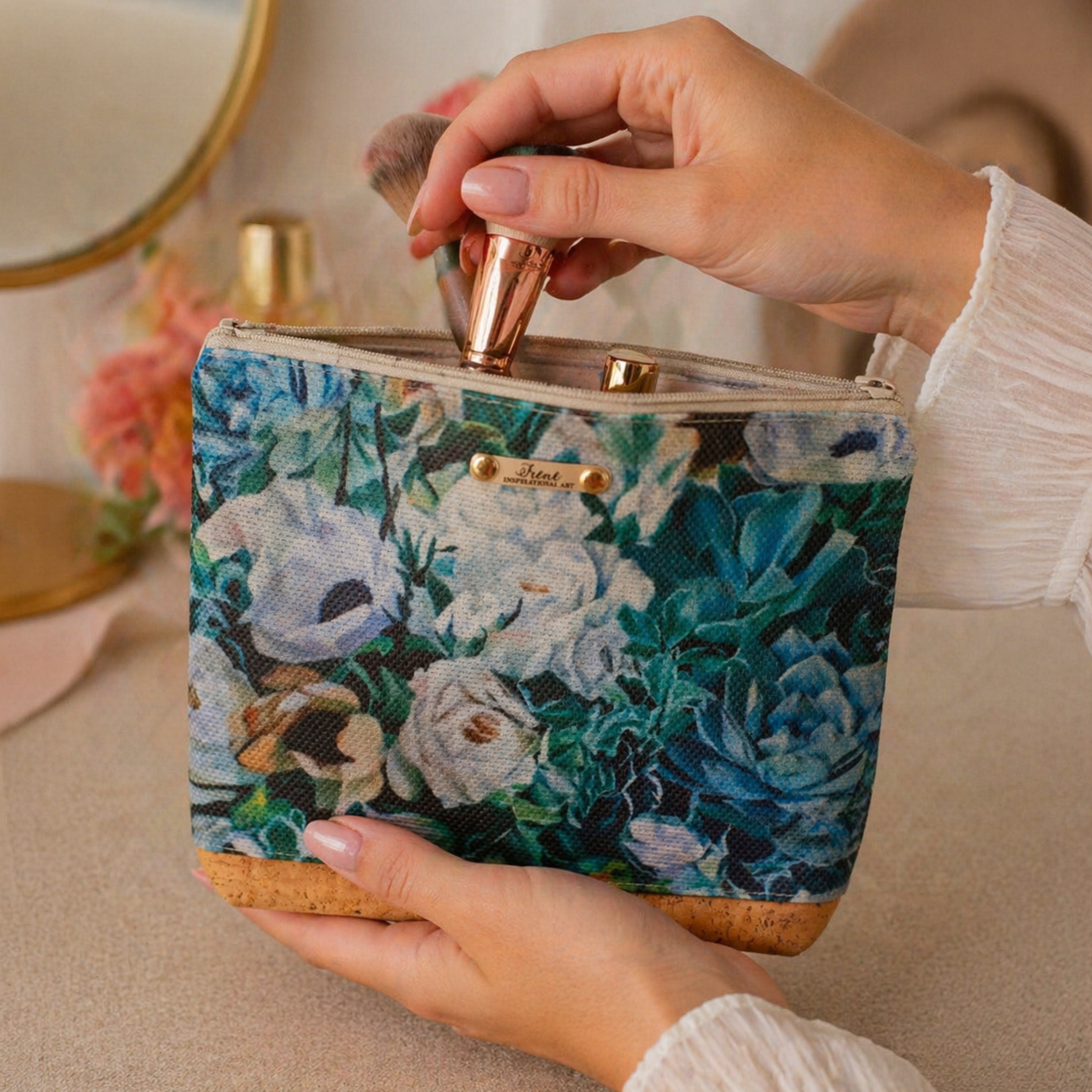 This beautiful makeup bag features a durable leather-look bottom with a printed waterproof fabric top, making it both elegant and easy to clean. Perfect for storing makeup, skincare, brushes, and beauty essentials at home or on the go.
